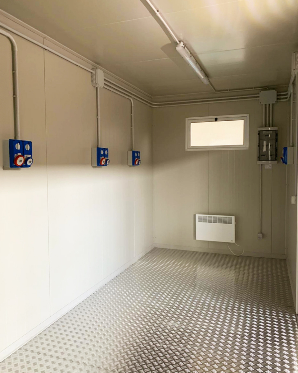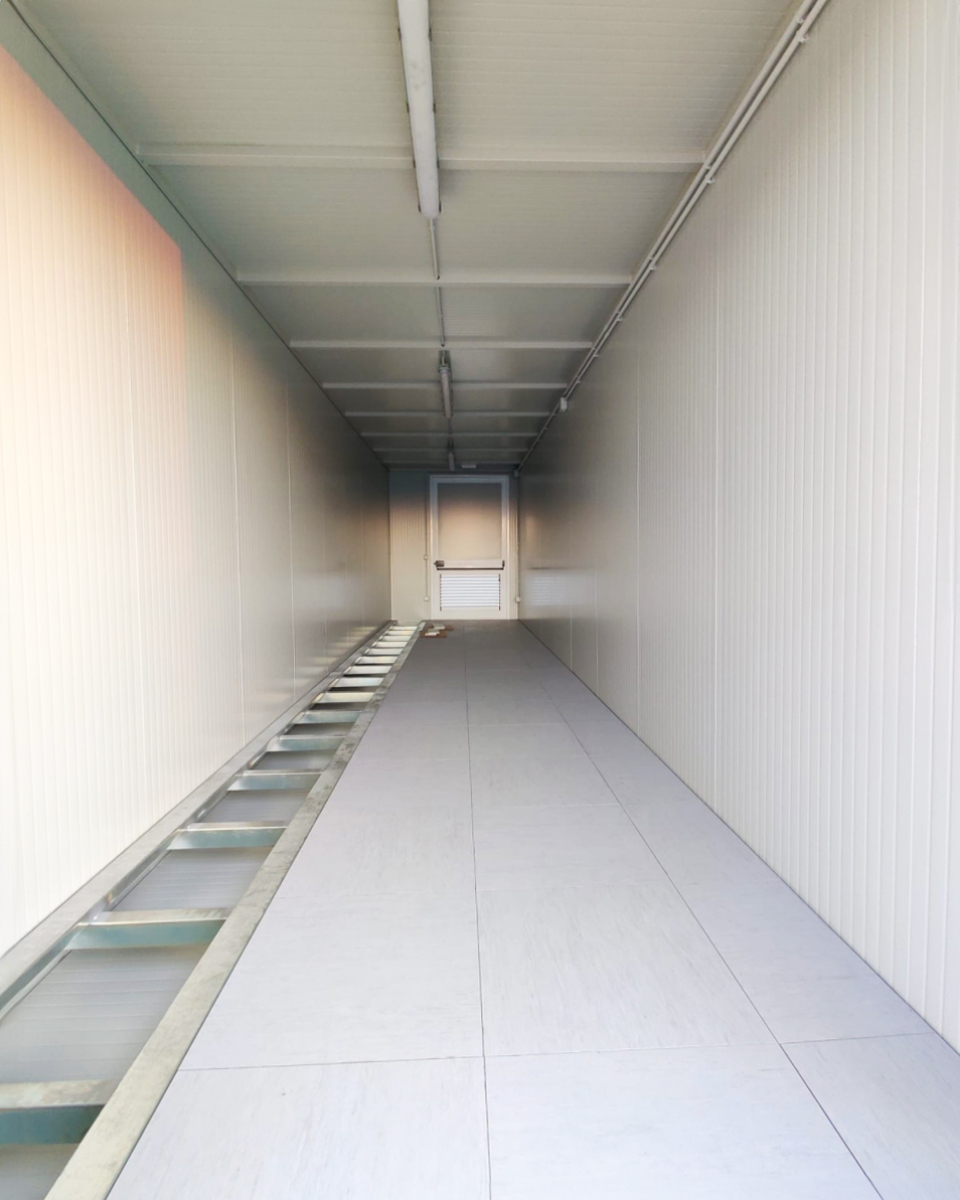 arrow_downward- Serramenti in alluminio b.co RAL 9010 - Griglie anti/insetto di aerazione - Possibilità anche di avere il pavimento flottante in quadrotti da.cm 60x60 - Pavimento in grigliato di acciaio zincato - Forature a pavimento - Impianto elettrico