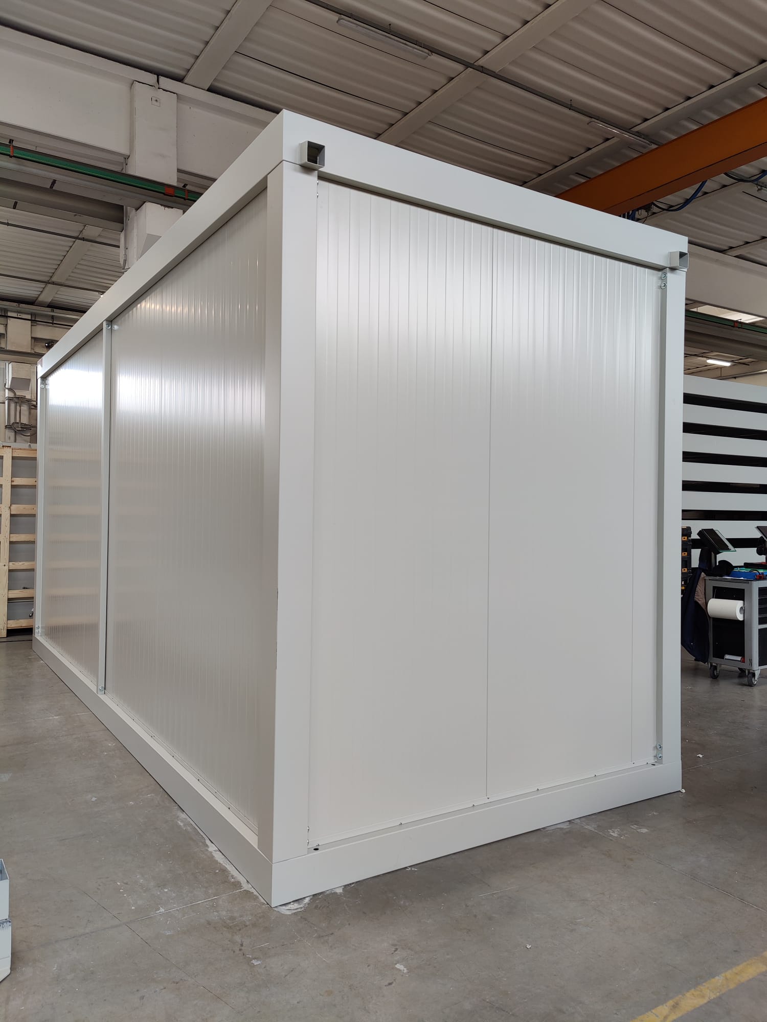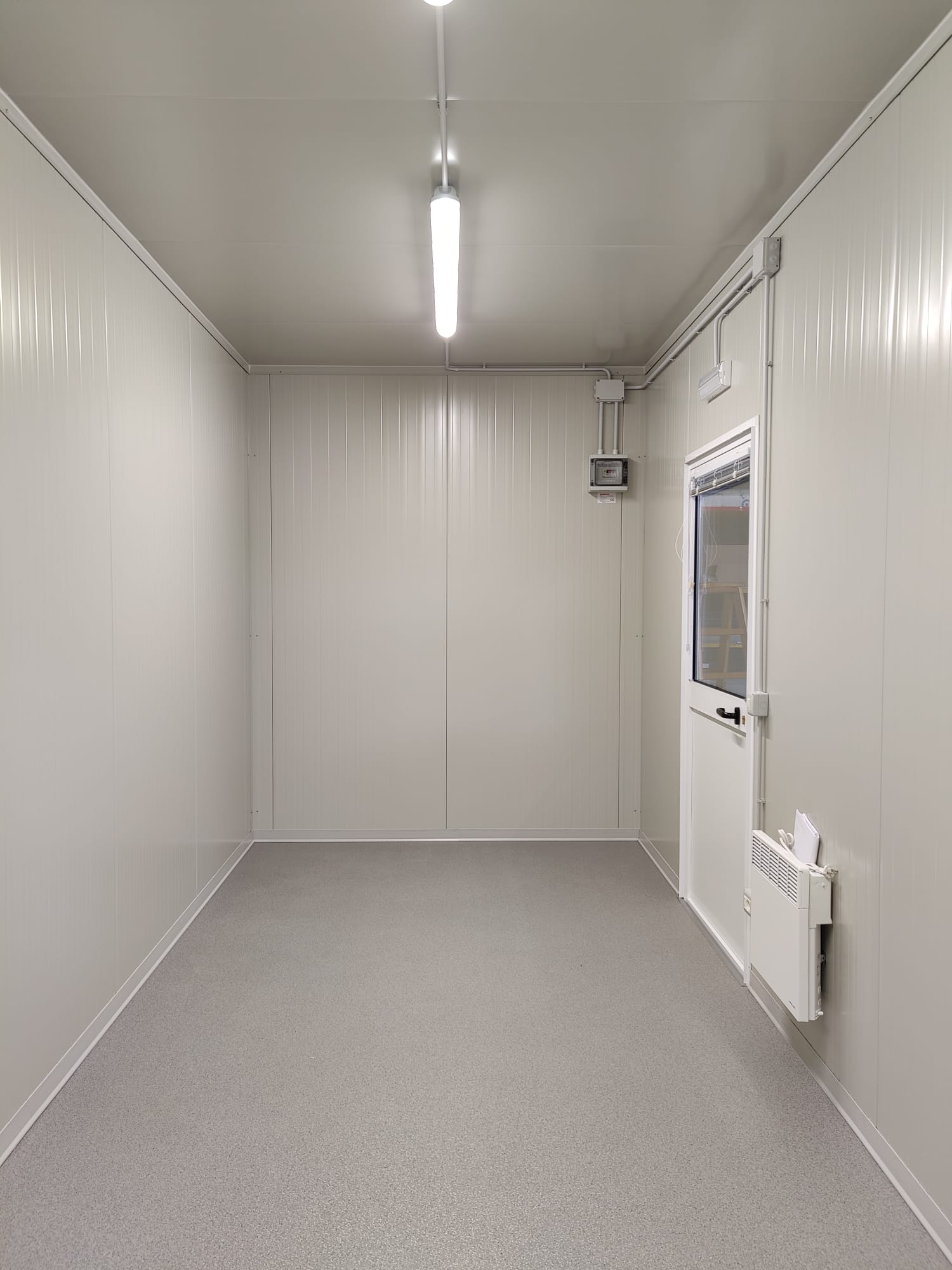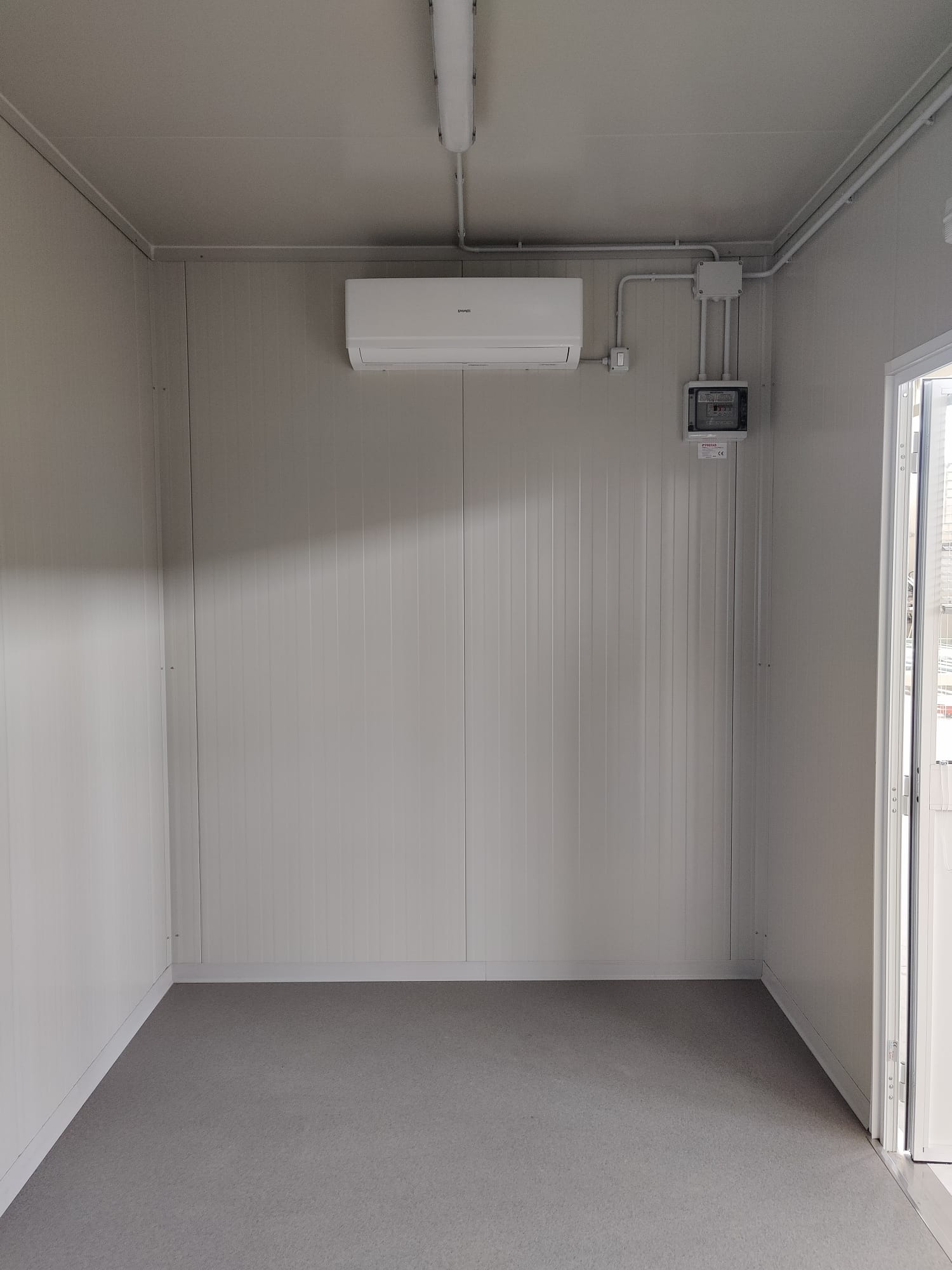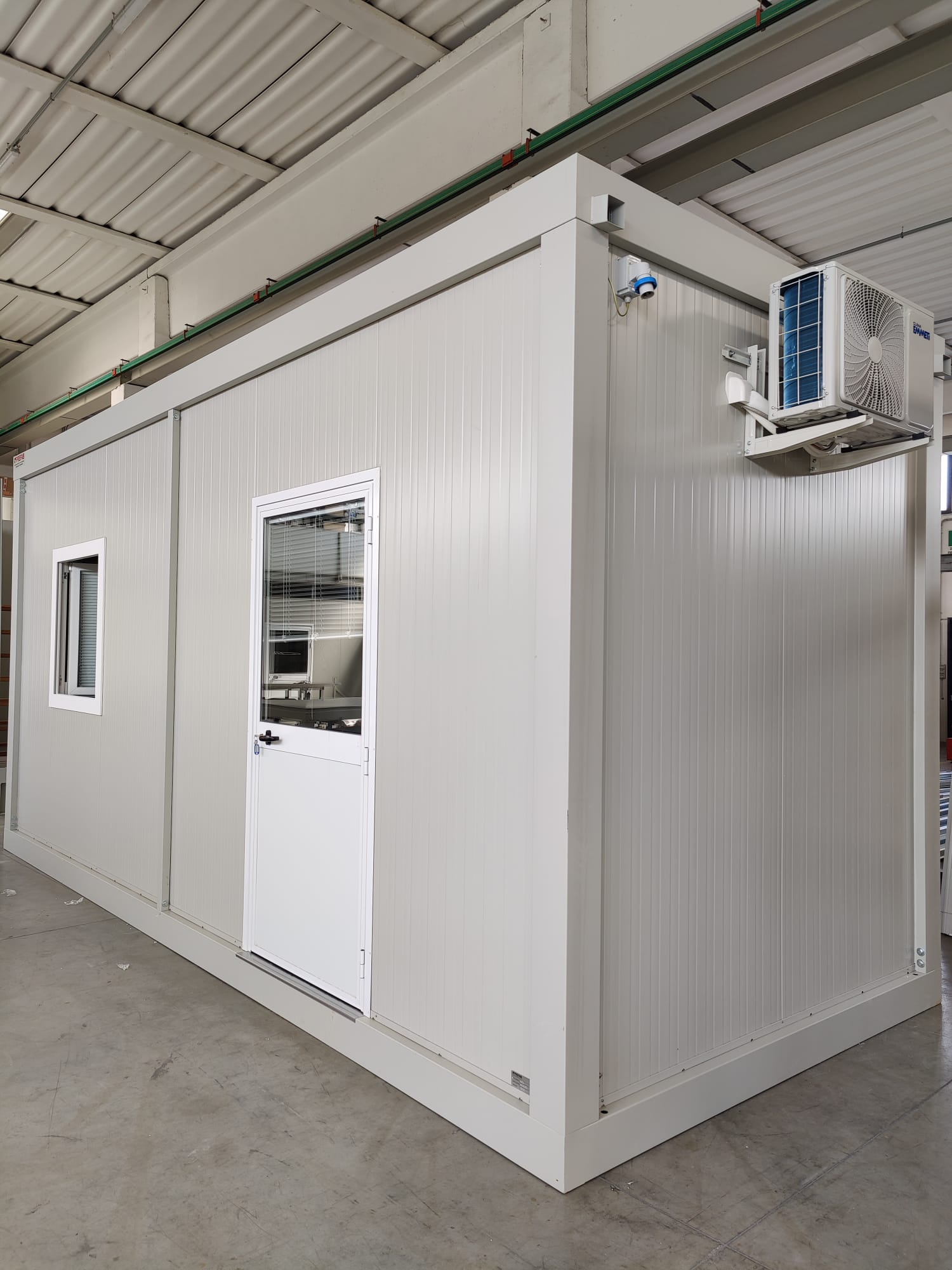 Modulo dimensioni esterne mm 6000x2440x3025H, altezza interna 2700 mm completo di: n. 1 porta esterna 1/2 vetrata mm 970x2063H n. 1 finestra anta/ribalta mm 970x1050H n. 1 quadro elettrico n. 2 plafoniera Led 55W con interruttore n. 1 presa elettrica 220V n. 1 termoconvettore elettrico n. 1 climatizzatore monosplit inverter pompa di calore 12.000 btu