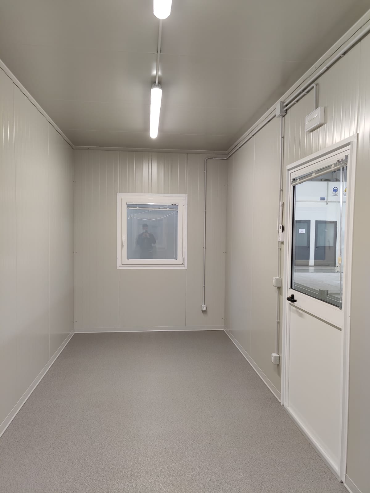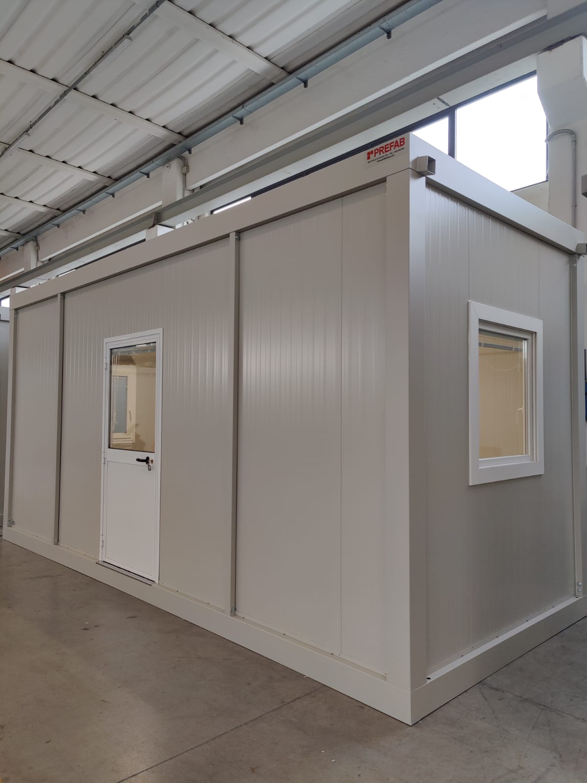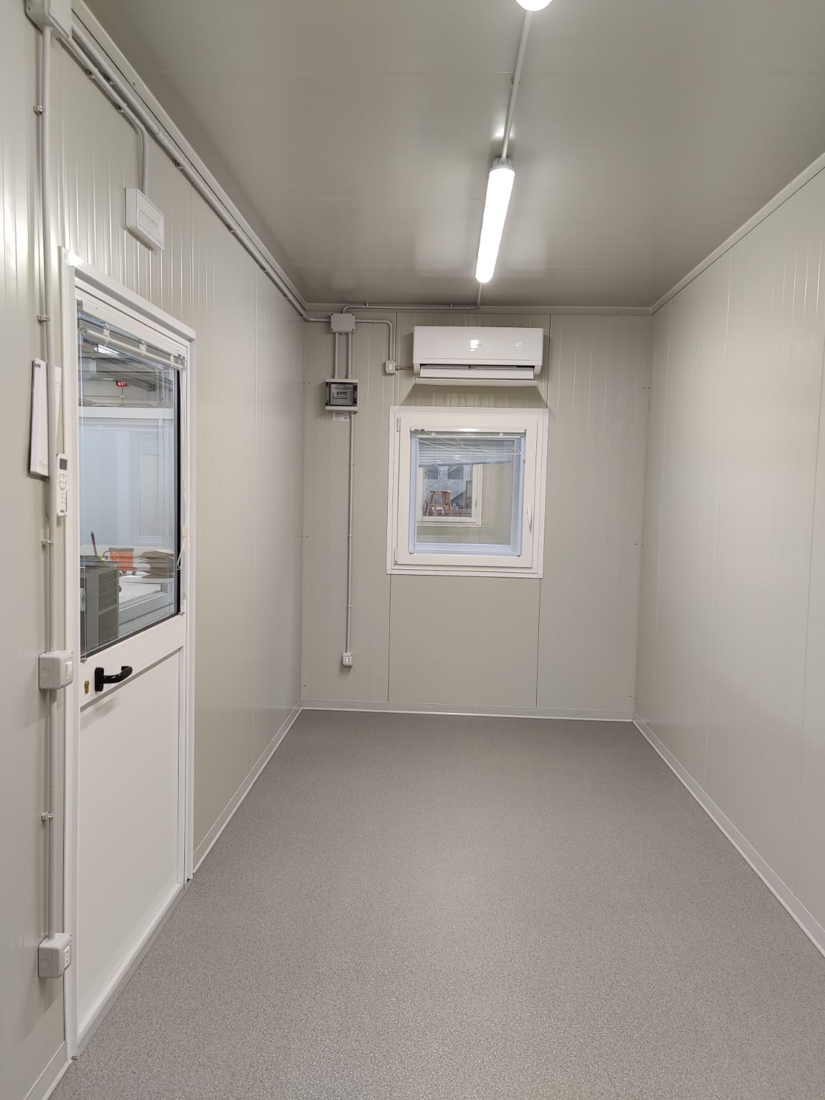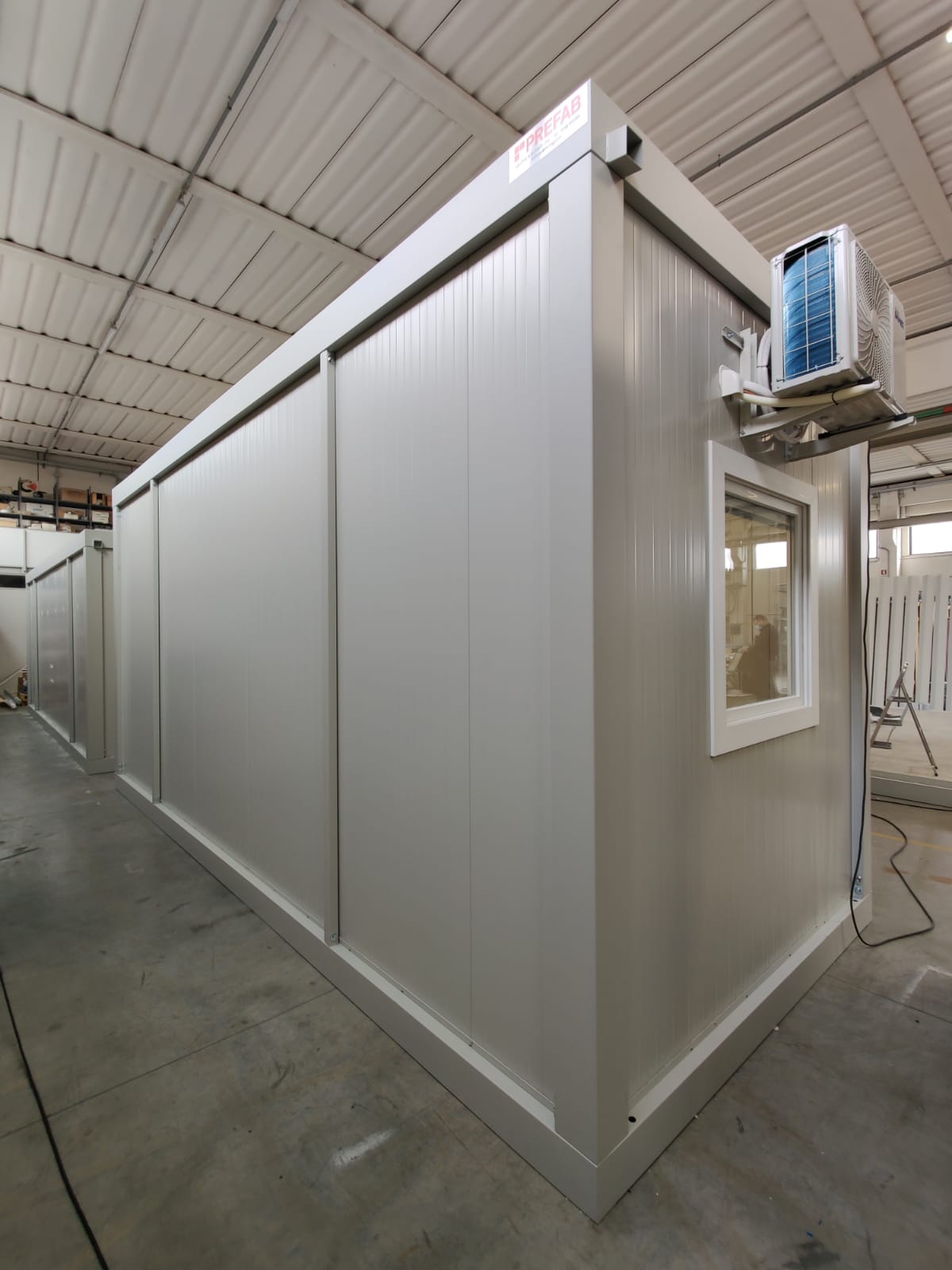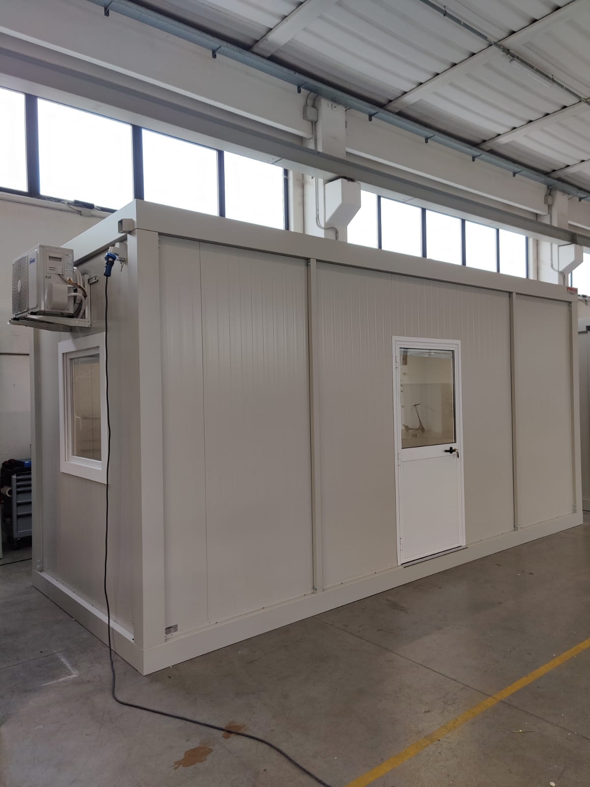 Modulo dimensioni esterne mm 6000x2440x3025H, altezza interna 2700 mm completo di: n. 1 porta esterna 1/2 vetrata mm970x2063H n. 2 finestre anta/ribalta mm 970x1050H n. 1 quadro elettrico n. 2 presa elettrica doppia 220V n. 2 plafoniere Led 55W con interruttore nr. 1 climatizzatore monosplit pompa di calore 12.000btu