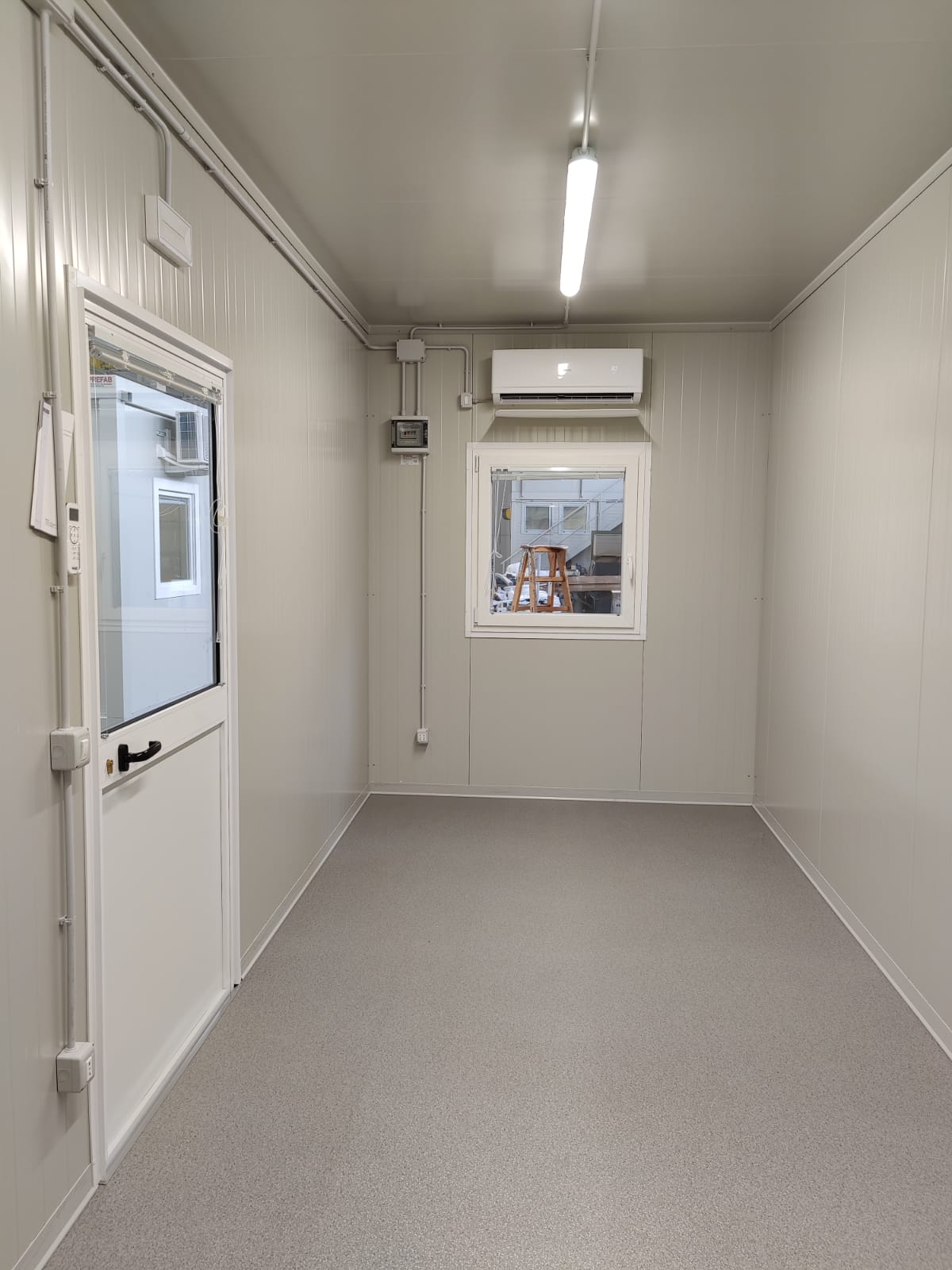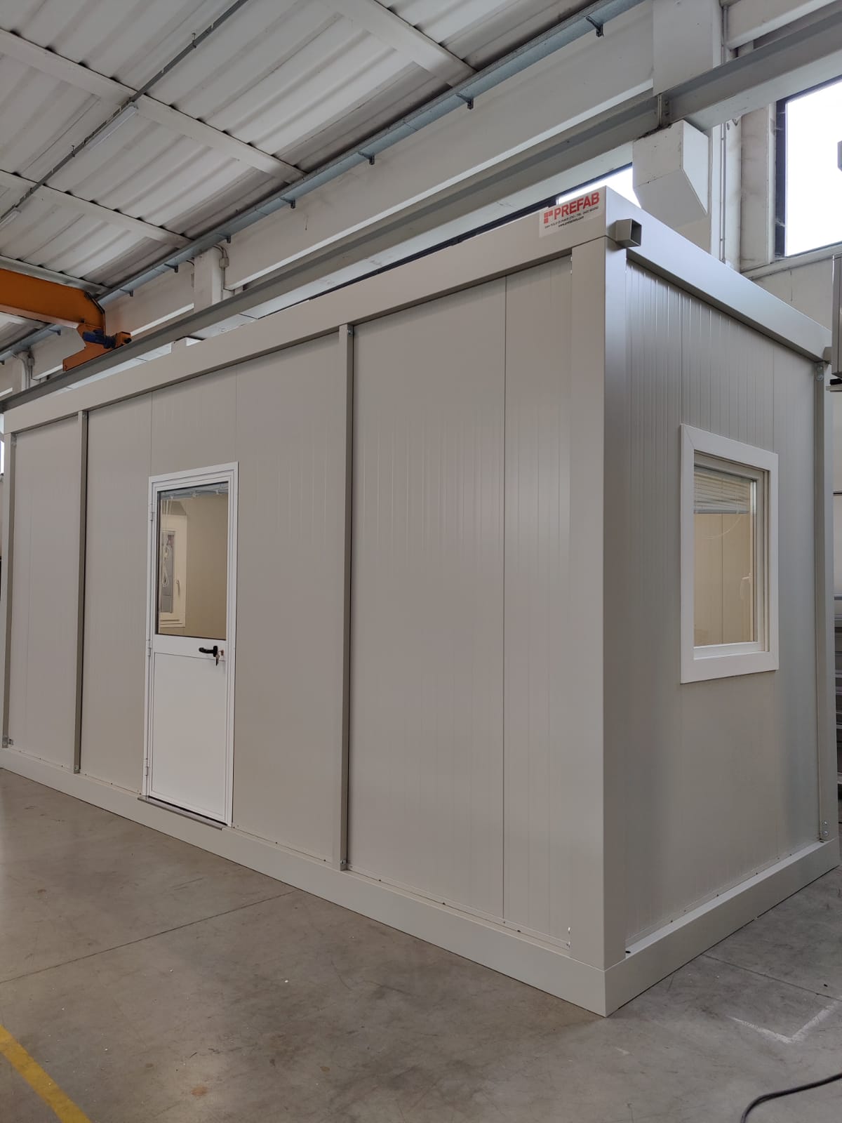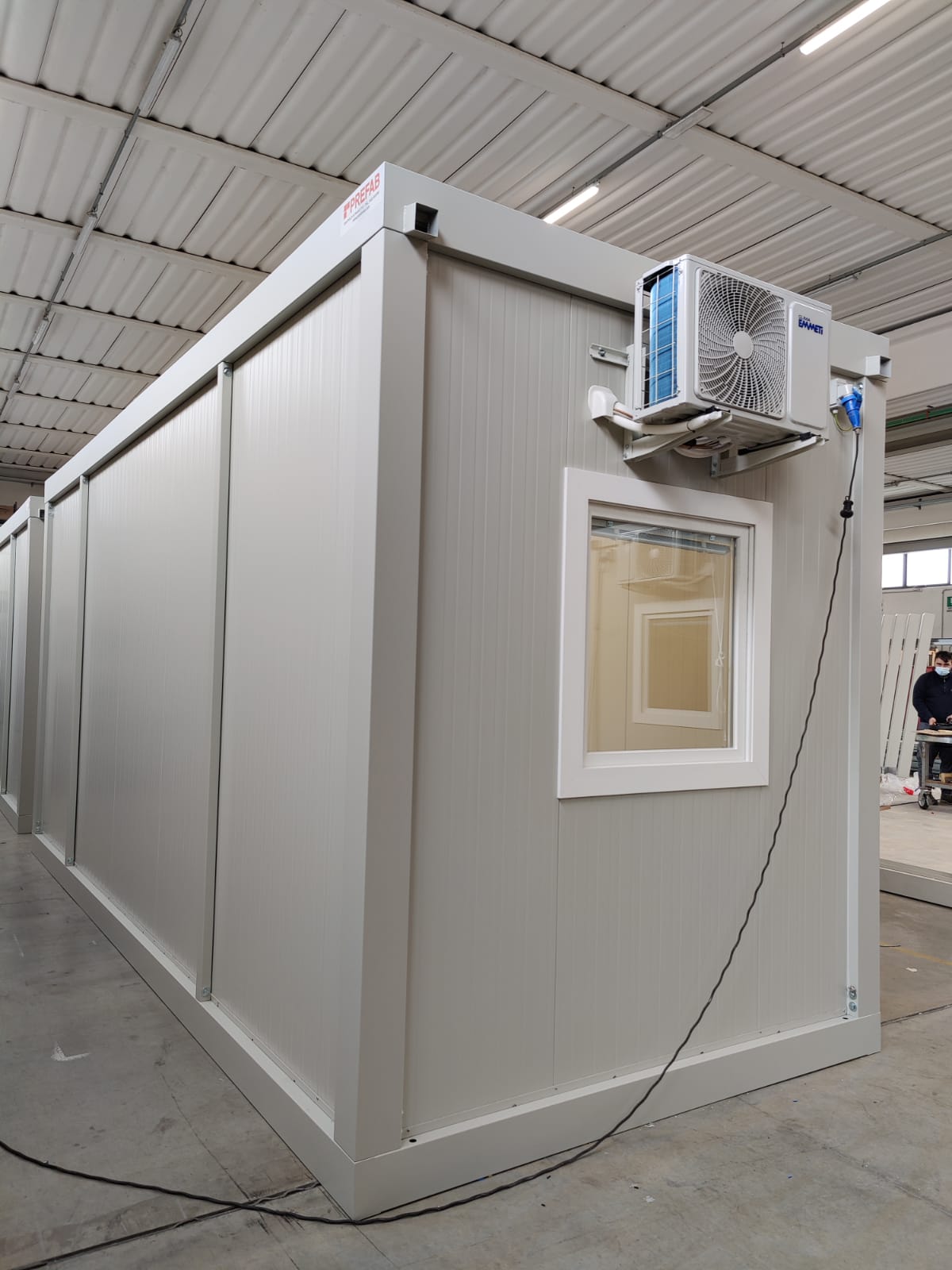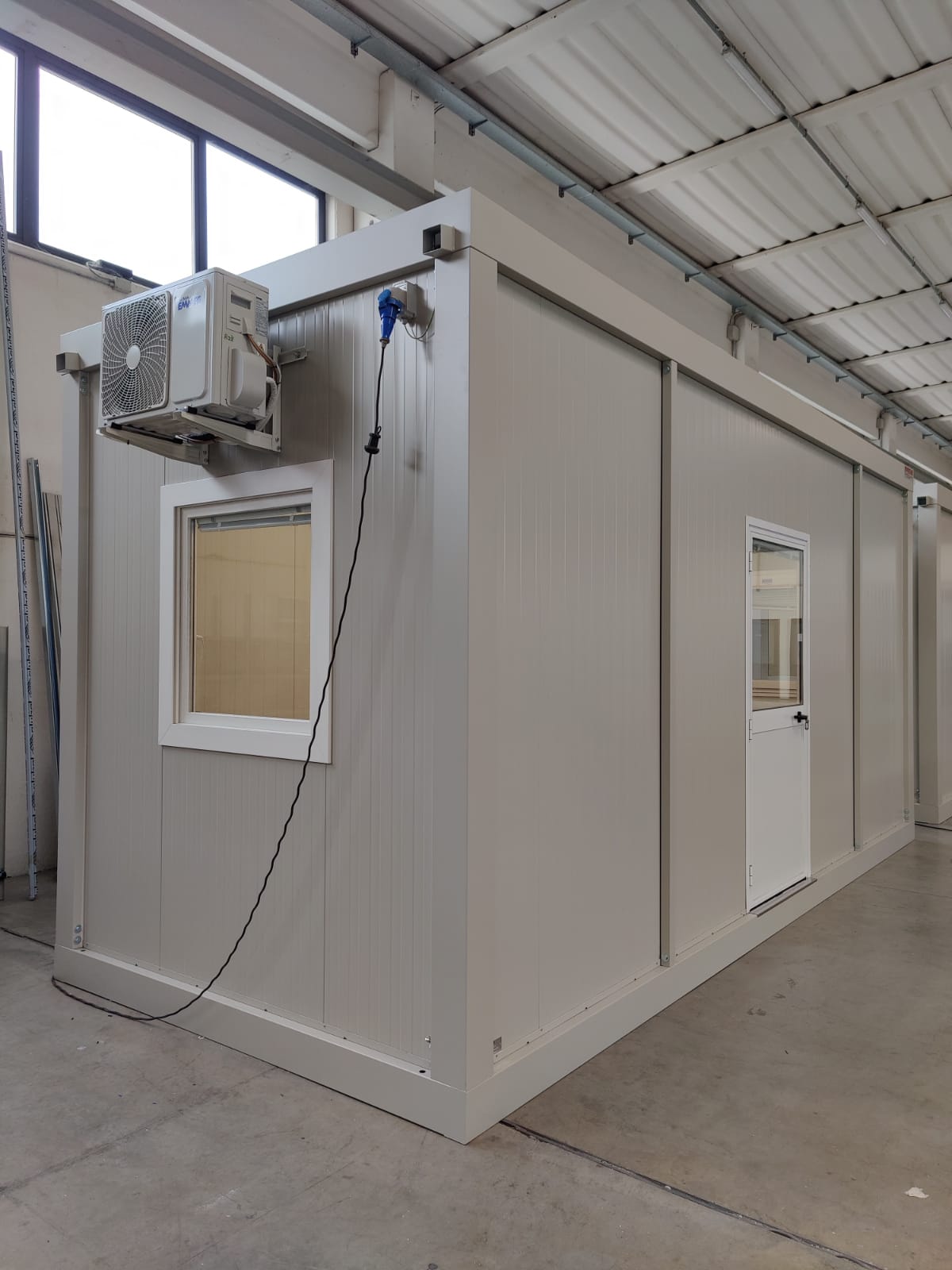 Modulo dimensioni esterne mm 6000x2440x3025H, altezza interna 2700 mm completo di: n. 1 porta esterna 1/2 vetrata mm970x2063H n. 2 finestre anta/ribalta mm 970x1050H n. 1 quadro elettrico n. 2 presa elettrica doppia 220V n. 2 plafoniere Led 55W con interruttore n. 1 climatizzatore monosplit pompa di calore 12.000btu