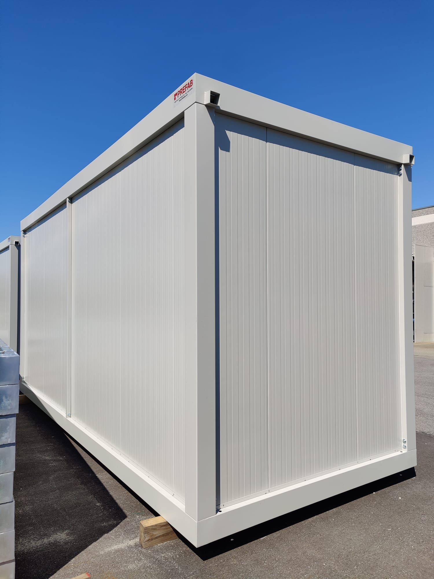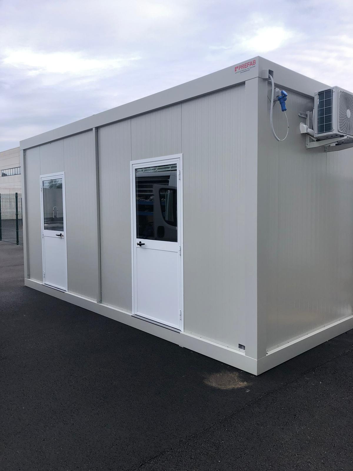 Modulo dimensioni esterne mm 6000x2440x3025H, altezza interna 2700 mm completo di: n. 2 porte esterne 1/2 vetrate, mm 970x2063H n. 1 quadro elettrico n. 2 plafoniera Led 55W con interruttore n. 1 presa elettrica 220V n. 1 termoconvettore elettrico n. 1 climatizzatore monosplit inverter pompa di calore 12.0000btu