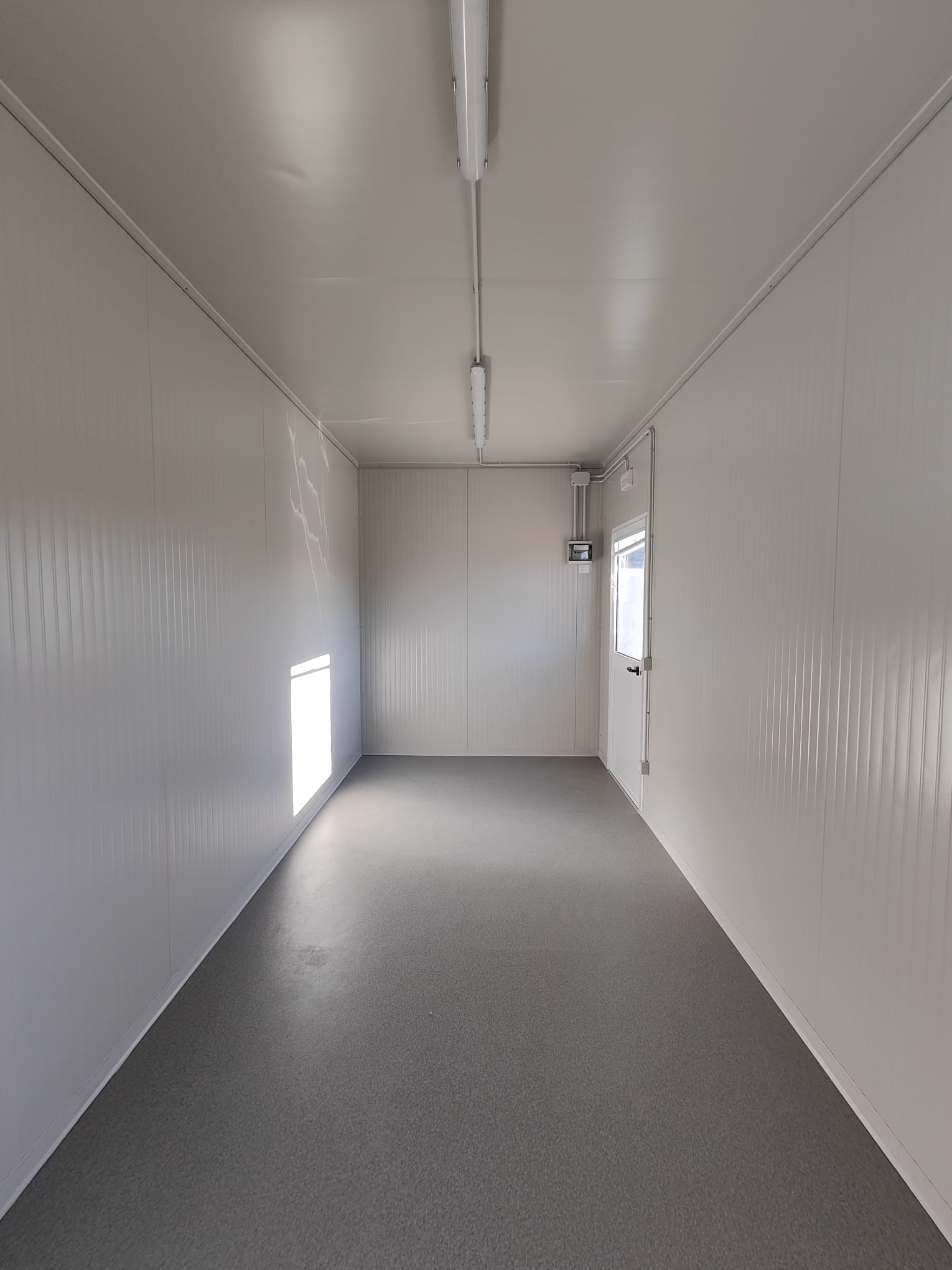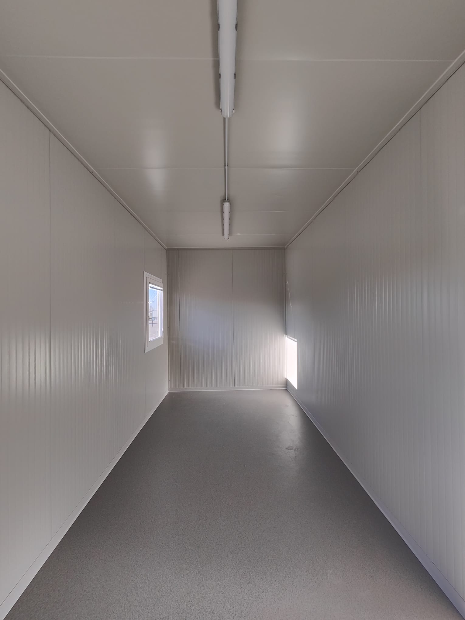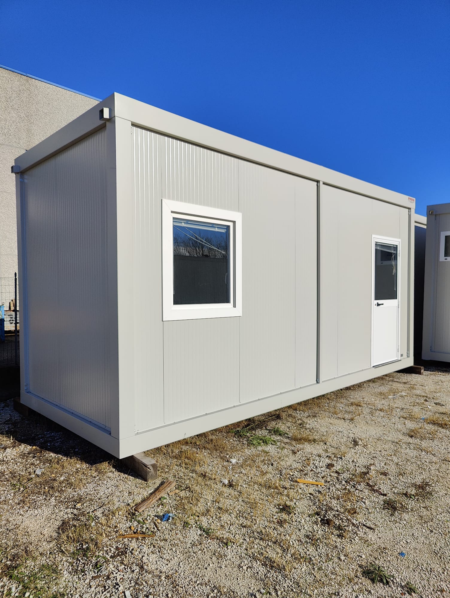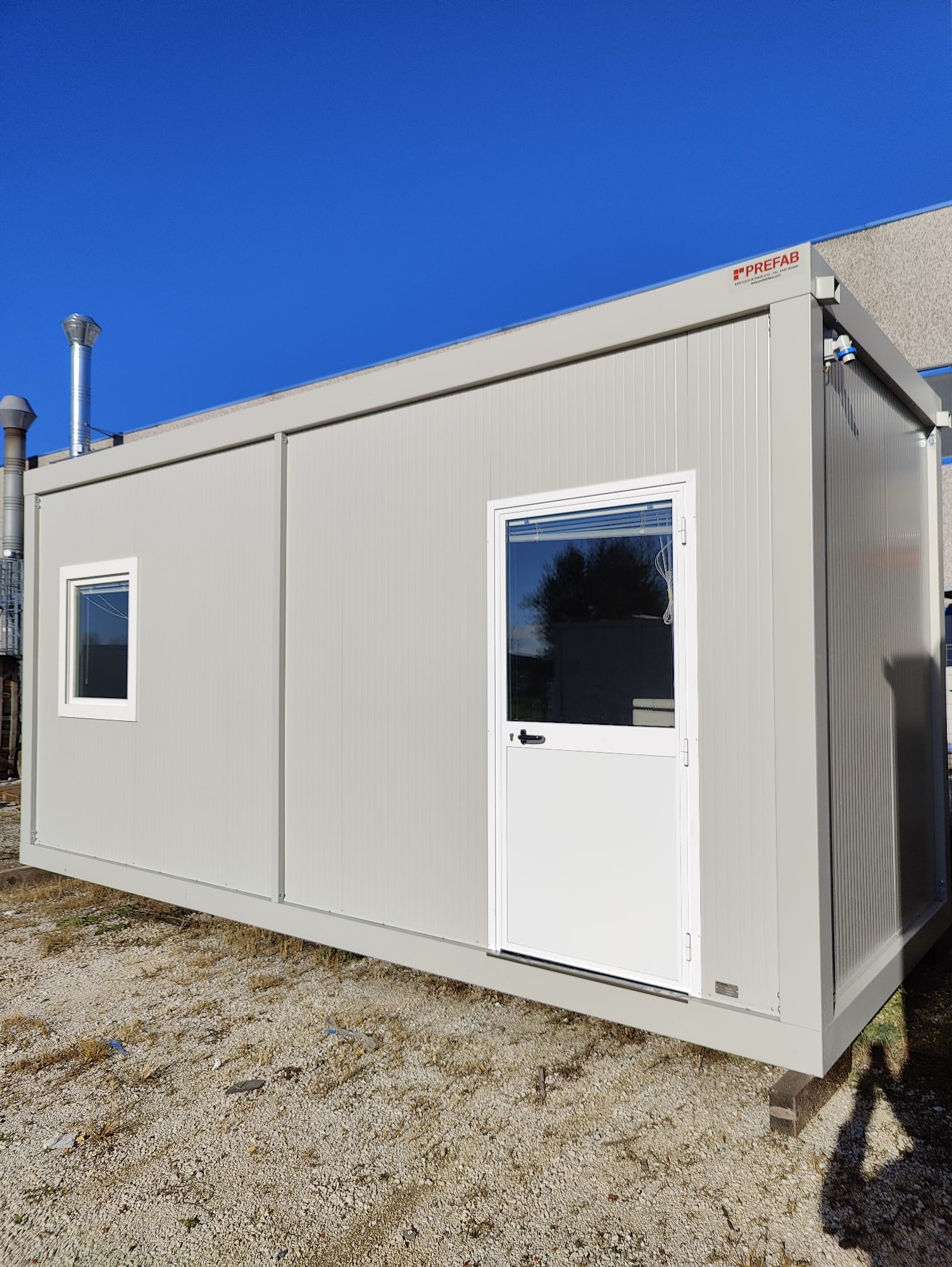 Modulo dimensioni esterne mm 6000x2440x3025H, altezza interna 2700 mm completo di: n. 1 porta esterna 1/2 vetrata, mm 970x2063H n. 1 finestra anta/ribalta, mm 970x1050H n. 1 quadro elettrico n. 2 plafoniera 46W con interruttore n. 1 presa elettrica 220V n. 1 climatizzatore monosplit inverter pompa di calore 12.000 btu