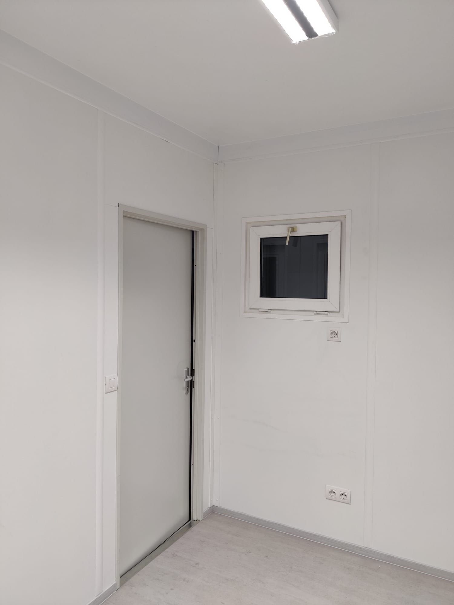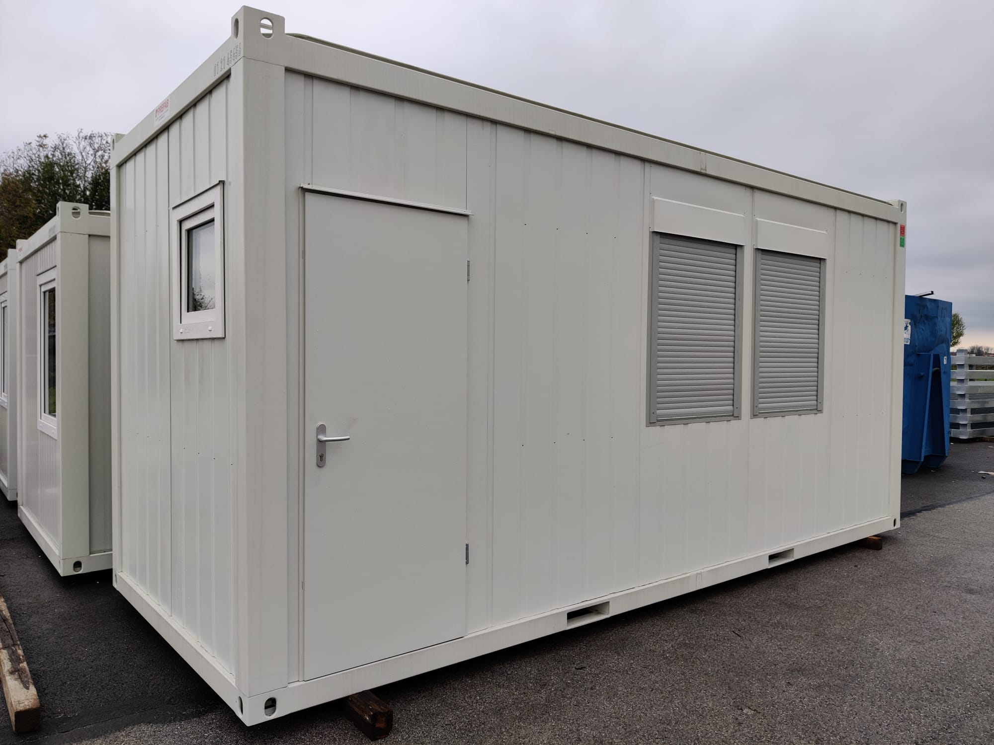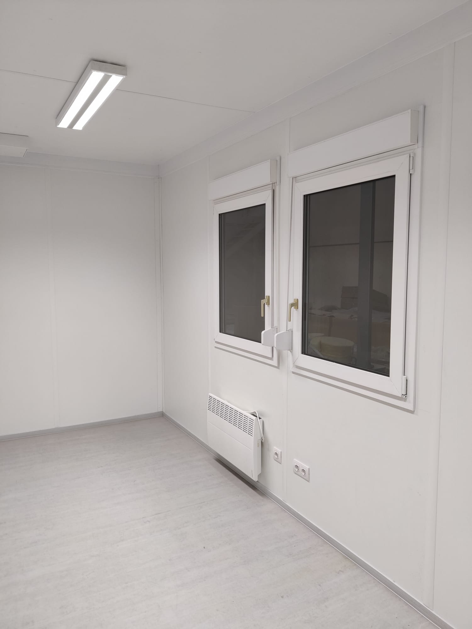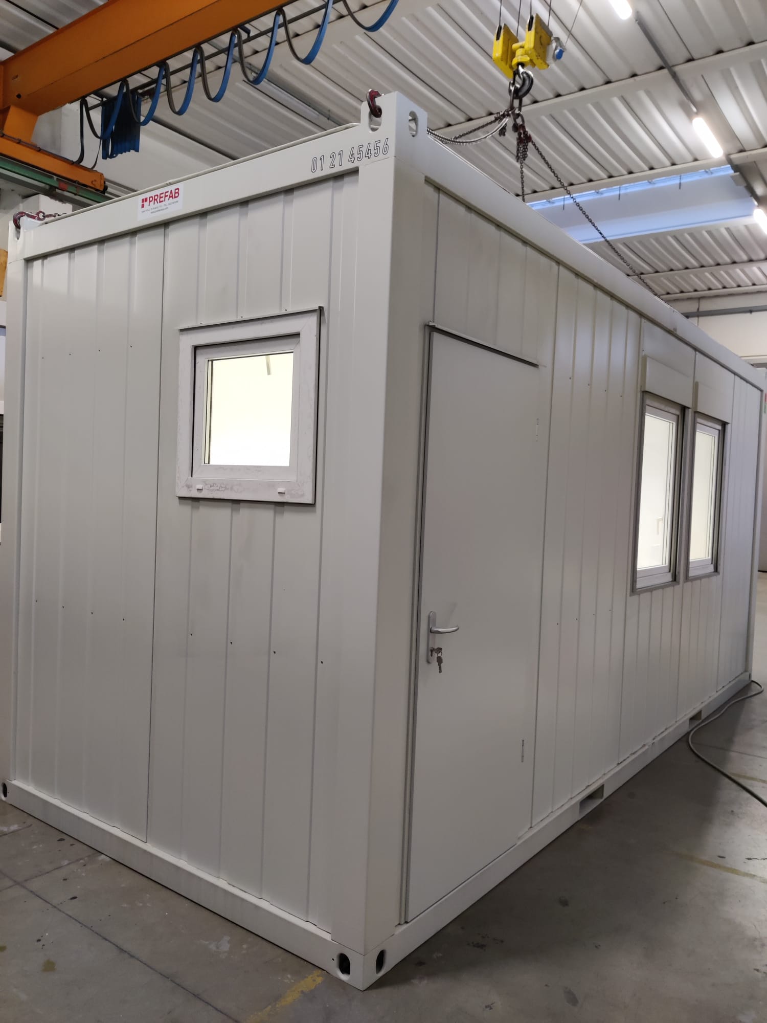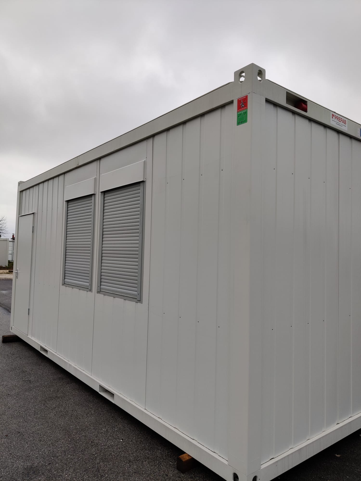 Modulo prefabbricato di dimensioni esterne pari a mm.6055x2435x2960 Altezza interna mm.2700 Serramenti n. 1 porta esterna cieca mm 800x2065H n. 2 finestra A/R mm 8755x2000H n. 1 finestrella per predisposizione climatizzatore monoblocco n. 1 quadro elettrico n. 2 plafoniera a Led con interruttore n. 2 presa elettrica 220V n. 1 stufetta elettrica