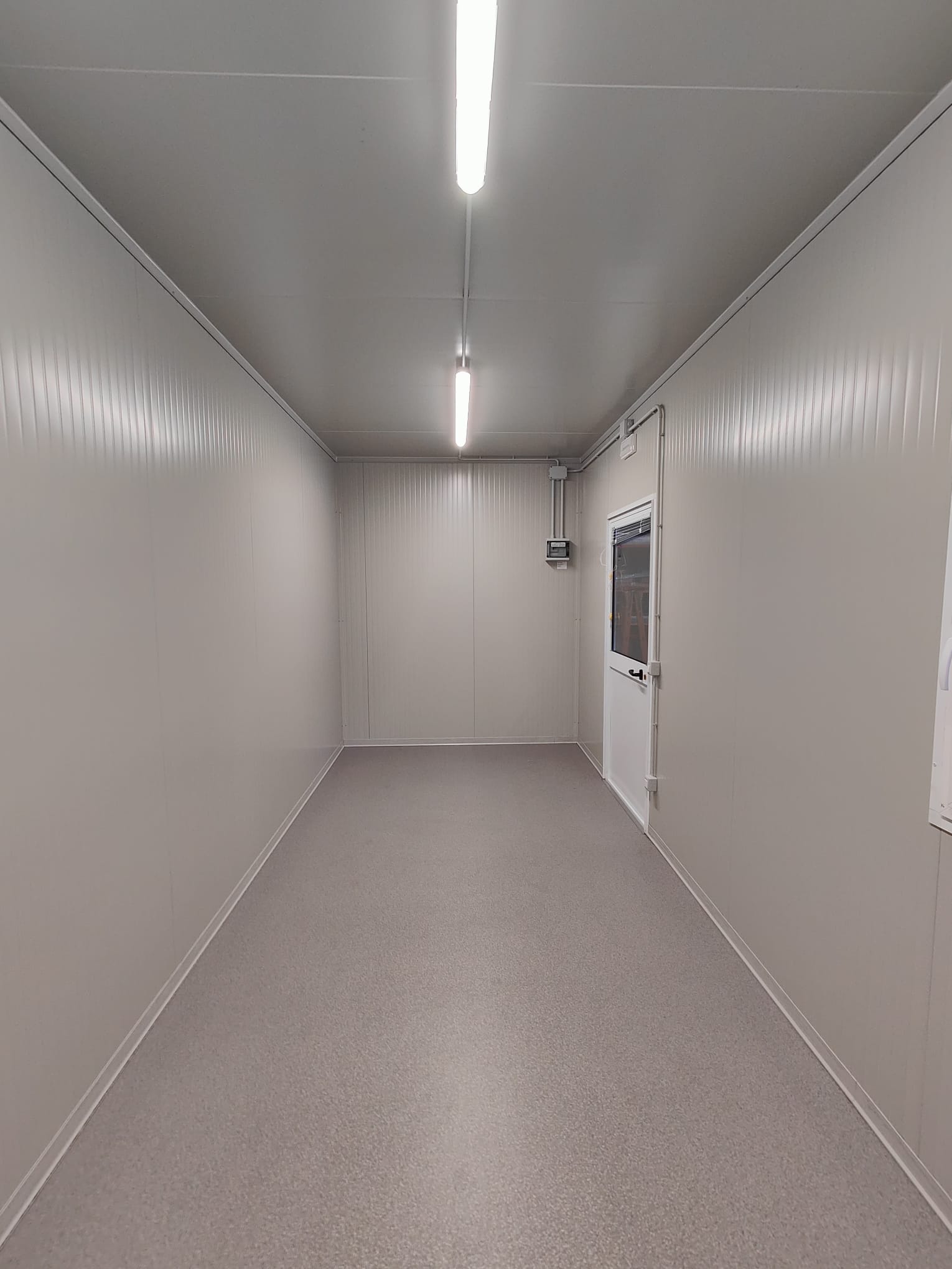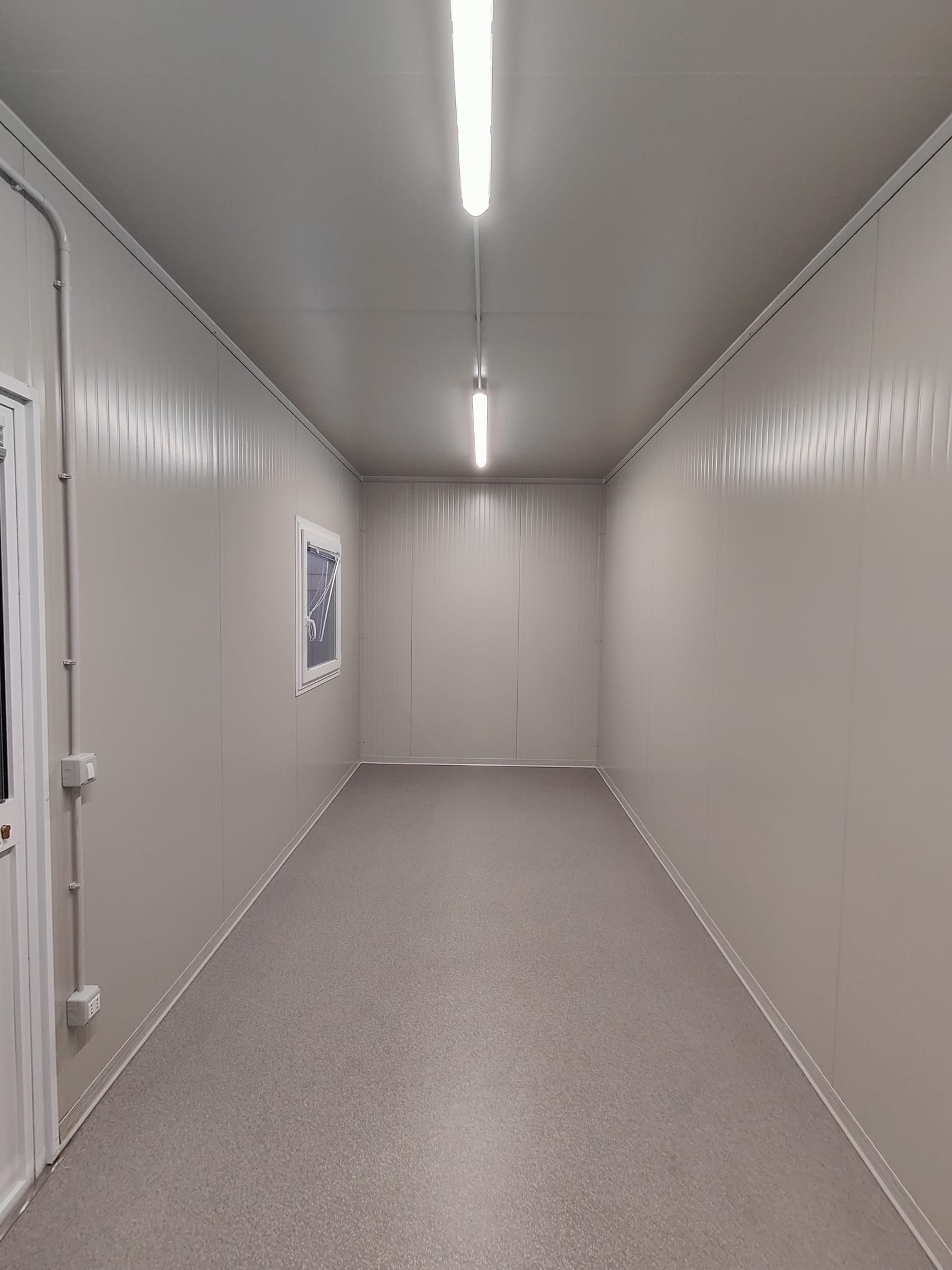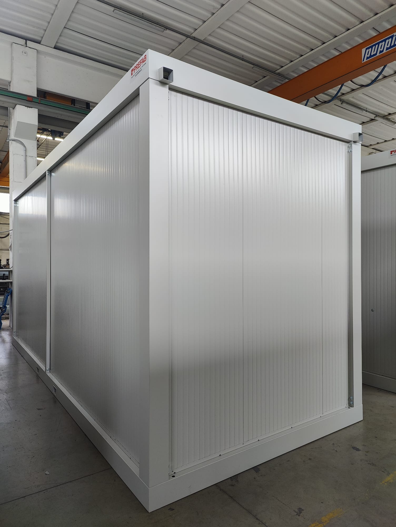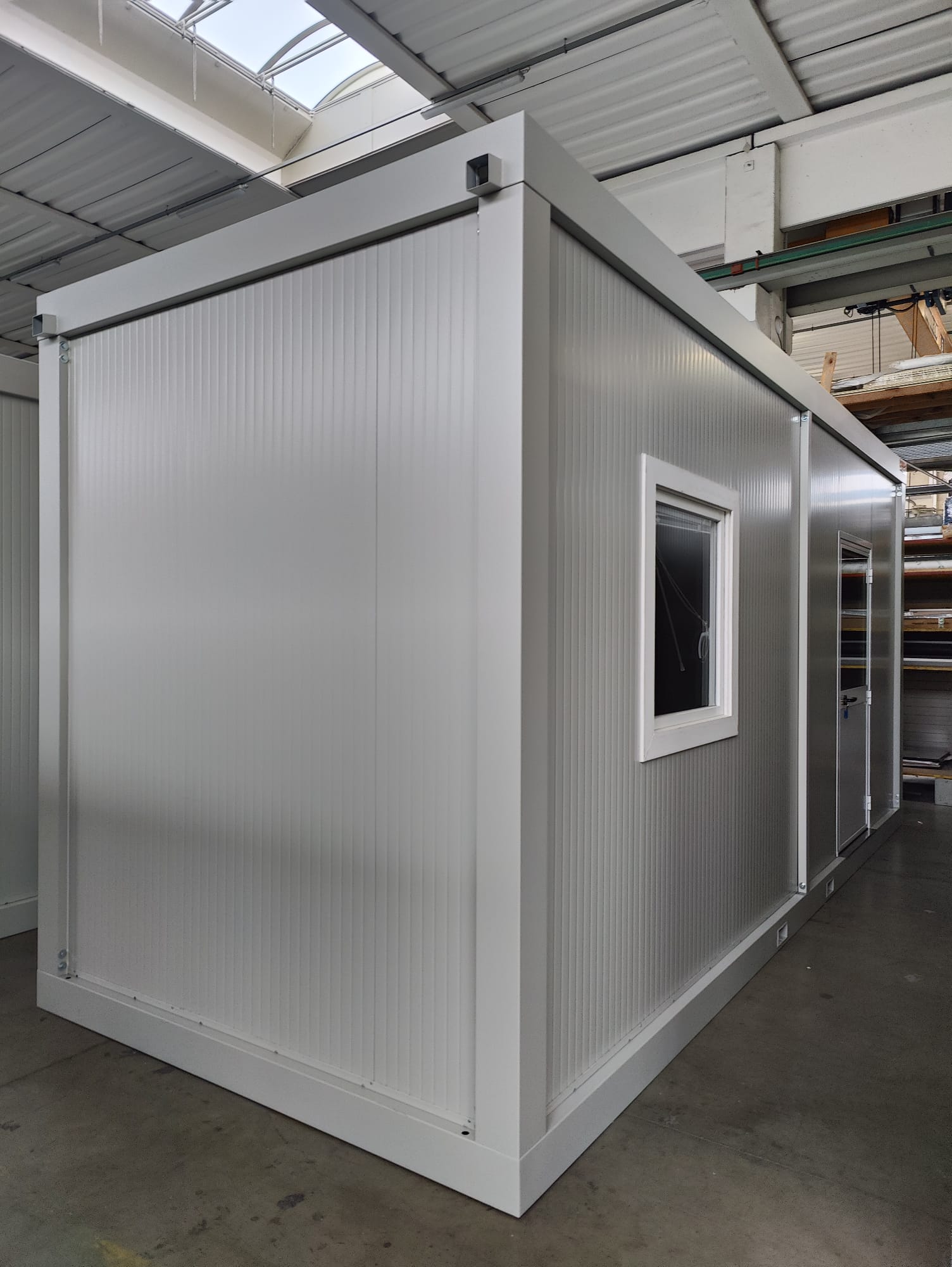 Modulo dimensioni esterne mm 6000x2440x3025H, altezza interna 2700 mm completo di: n. 1 porta esterna 1/2 vetrata mm 970x2063H n. 1 finestra anta/ribalta mm 970x1050H n. 1 quadro elettrico n. 2 plafoniera Led 46W con interruttore n. 1 presa elettrica 220V. Presenta le tasche per la movimentazione con le forche del muletto.